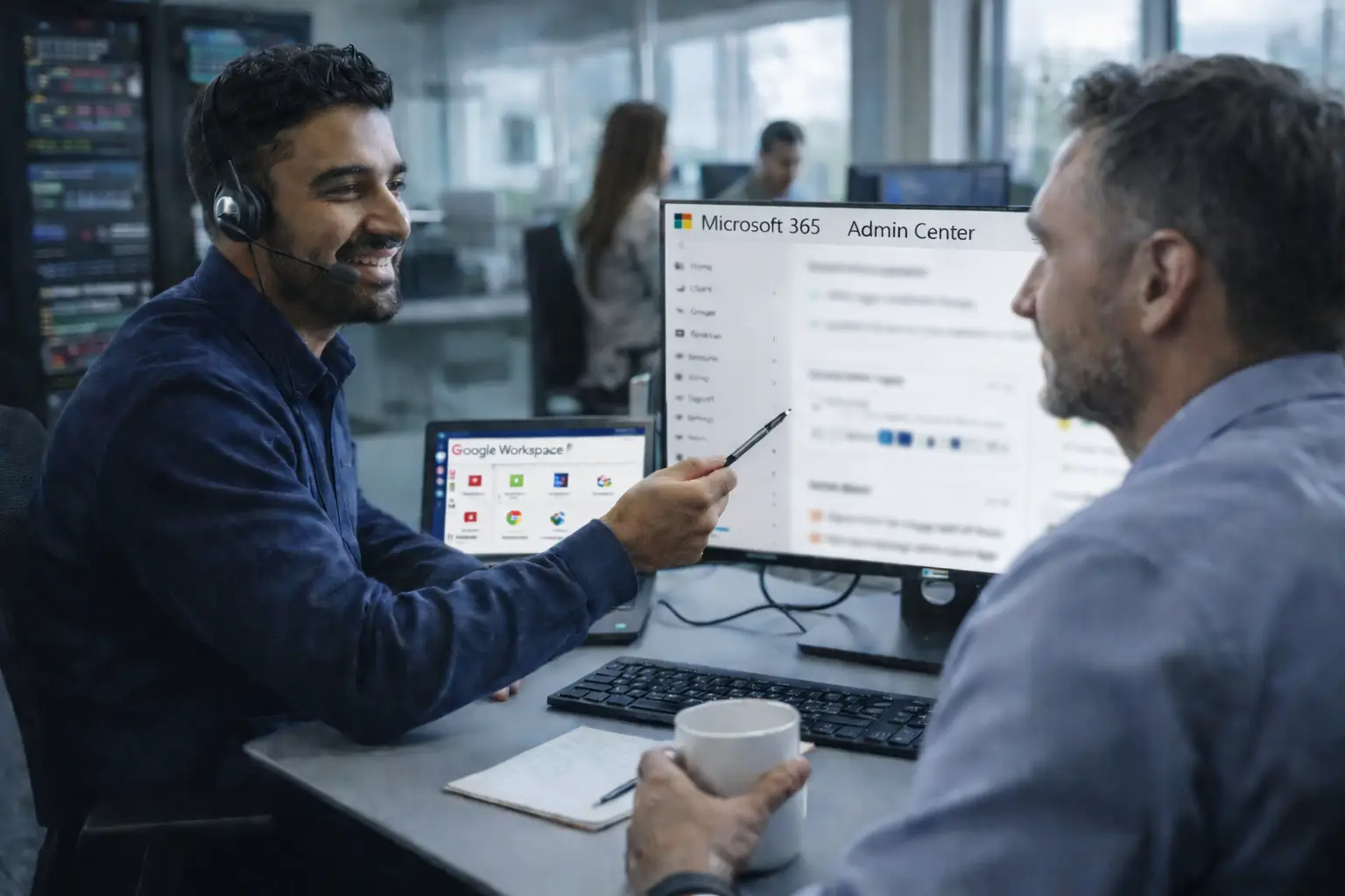 On top of that, we specialise in Microsoft 365 and Google Workspace environments, helping you get the most from the tools you already pay for—whether that’s managing accounts and licences, setting up secure email, configuring policies and permissions, improving collaboration with Teams/SharePoint/OneDrive or Google Drive/Docs/Meet, and keeping everything organised as your business grows.
